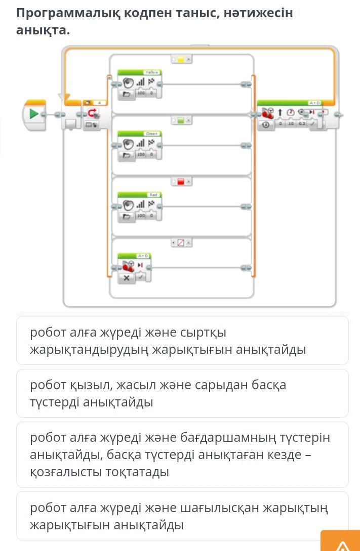 робот алға жүреді және бағдаршамның түстерін анықтайды, басқа түстерді анықтаған кезде – қозғалысты тоқтатады