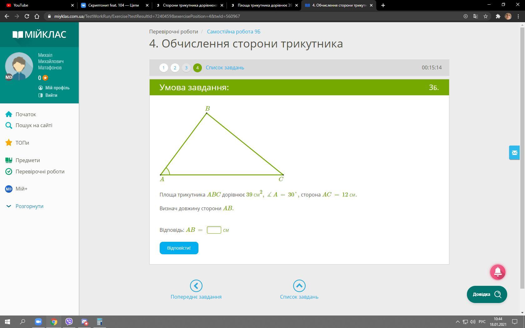 "Площадь треугольника ABC равна 39 см2, ∡A=30°, сторона AC=12 см. Определи длину стороны AB."