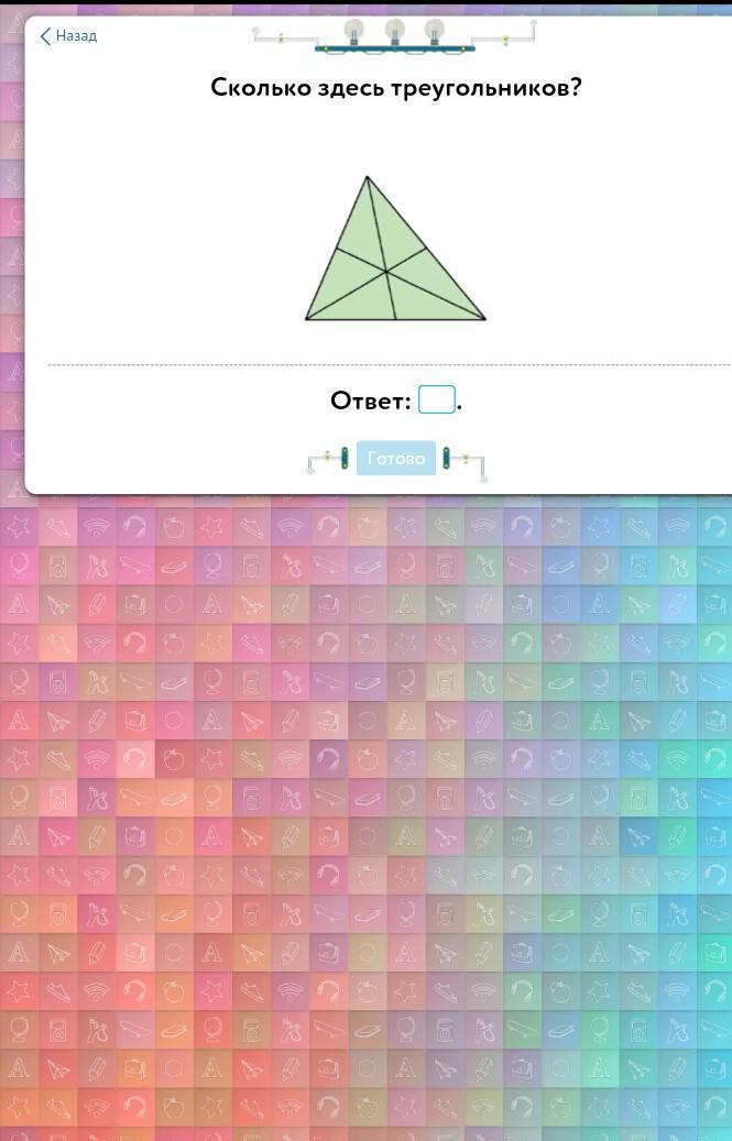 1 треугольник основной. потом 6 треугольников маленьких. 3 треугольника состоящих из 2 маленьких треугольников. и еще 6 треугольников состоящих из 3 маленьких треугольников. получается 1+6+3+6=16 треугольников