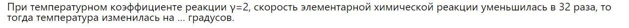 При температурном коэффициенте реакции γ=2, скорость элементарной химической реакции уменьшилась в 32 раза, то тогда температура изменилась на … градусов.