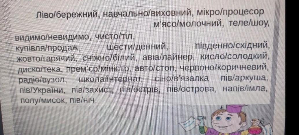 лівобережний , навчально виховний, мікро-процесор, м'ясо-молочний, теле-шоу ,чистотіл, купівля-продаж, шестиденний, південно-східній, жовто-гарячий, сніжно- білий, авіалайнер, кисло-солодкий, дискотека,прим'єр-міністр, автостоп , червоно-коричневий , радіо-вузол, школа-інтернат,сінов'язалка, пів аркуша, пів України, пів захист, пів острів,пів острова, напів -і мла ,полу-мисок, північ