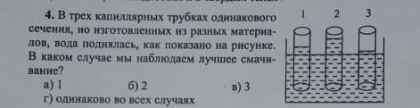 4. В трех капиллярных трубках одинакового сечения, но изготовленных из разных материа- лов, вода поднялась, как показано на рисунке. В каком случае мы наблюдаем лучшее смачи- вание? a) 1 г) одинаково во всех случаях 2 6) 2 в) 3