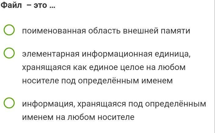 Файл — именованная область данных на носителе информации. Работа с файлами реализуется средствами операционных систем. Многие операционные системы приравнивают к файлам и обрабатывают сходным образом и другие ресурсы: области данных; устройства — как физические, например, порты или принтеры, так и виртуальные