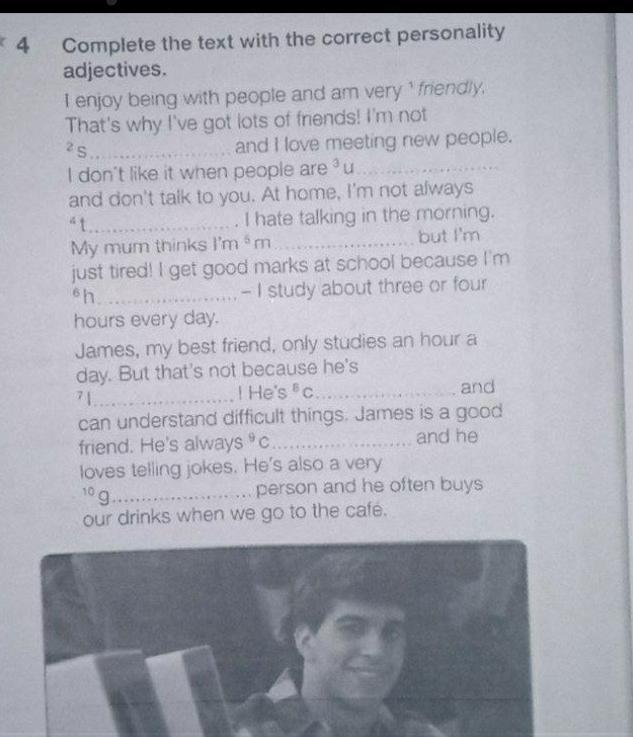 14:27 ll 28% Дополните текст правильными личностными прилагательными. Мне нравится быть с людьми, и я очень дружелюбен. Вот почему у меня много друзей! Я нет, и я люблю знакомиться с новыми людьми. Мне не нравится, когда люди такие, как ты, и не разговаривают с тобой. Дома я не всегда ненавижу говорить по утрам. но я, моя мама думает, что я просто устал! Я получаю хорошие оценки в школе, потому что мне хорошо. часов каждый день. - Я изучаю около трех-четырех Джеймс, мой лучший друг, только час в день. Но это не потому, что ему 71 год, он может понимать сложные вещи. Джеймс - хороший друг. Он всегда с. любит рассказывать анекдоты. Он тоже очень 10гр .. наши напитки, когда мы идем в кафе. ..I Он c. а он человек и он часто покупает 3АКПБИТБ