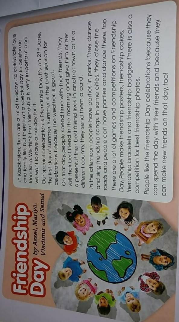 В Казахстане есть много праздников, посвященных любви и семейной жизни, но нет особого дня для празднования дружбы. Мы считаем, что дружба очень важна, и хотим устроить ей праздник. Наш особый праздник - День дружбы. Это 21 июня, первый день лета. Лето - лучшее время для праздников, потому что стоит хорошая погода. В этот день люди проводят время со своими друзьями. Утром они навещают лучшего друга и делают ему подарок. Если их лучший друг живет в другом городе или в другой стране, они отправляют им открытку. Днем в парках устраивают вечеринки. Они танцуют и поют песни дружбы. В некоторых городах закрывают дороги, и люди могут устраивать вечеринки и танцевать там. В День дружбы проходит много игр и конкурсов. Люди делают плакаты дружбы, торты дружбы, браслеты дружбы и значки дружбы. Также проводится конкурс на лучшие фотографии дружбы. Людям нравится праздновать День дружбы, потому что они могут провести день со своими друзьями, а также потому, что в этот день они могут найти новых друзей!