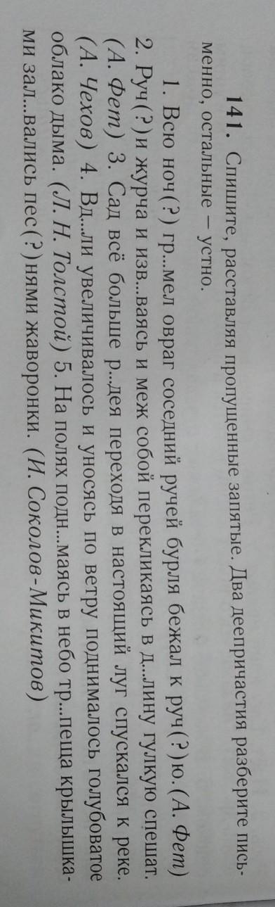 1. Всю ночь гремел овраг соседний, ручей, бурля, бежал к ручью. 2. Ручьи, журча и извиваясь и меж собой перекликаясь, в долину гулкую спешат. 3. Сад, все больше редея, переходя в настоящий луг, спускался к реке. 4. Вдали увеличивалось и, уносясь по ветру, поднималось голубоватое облако дыма. 5. На полях, поднимаясь в небо, трепеща крылышками, заливали ь песнями жаворонки.