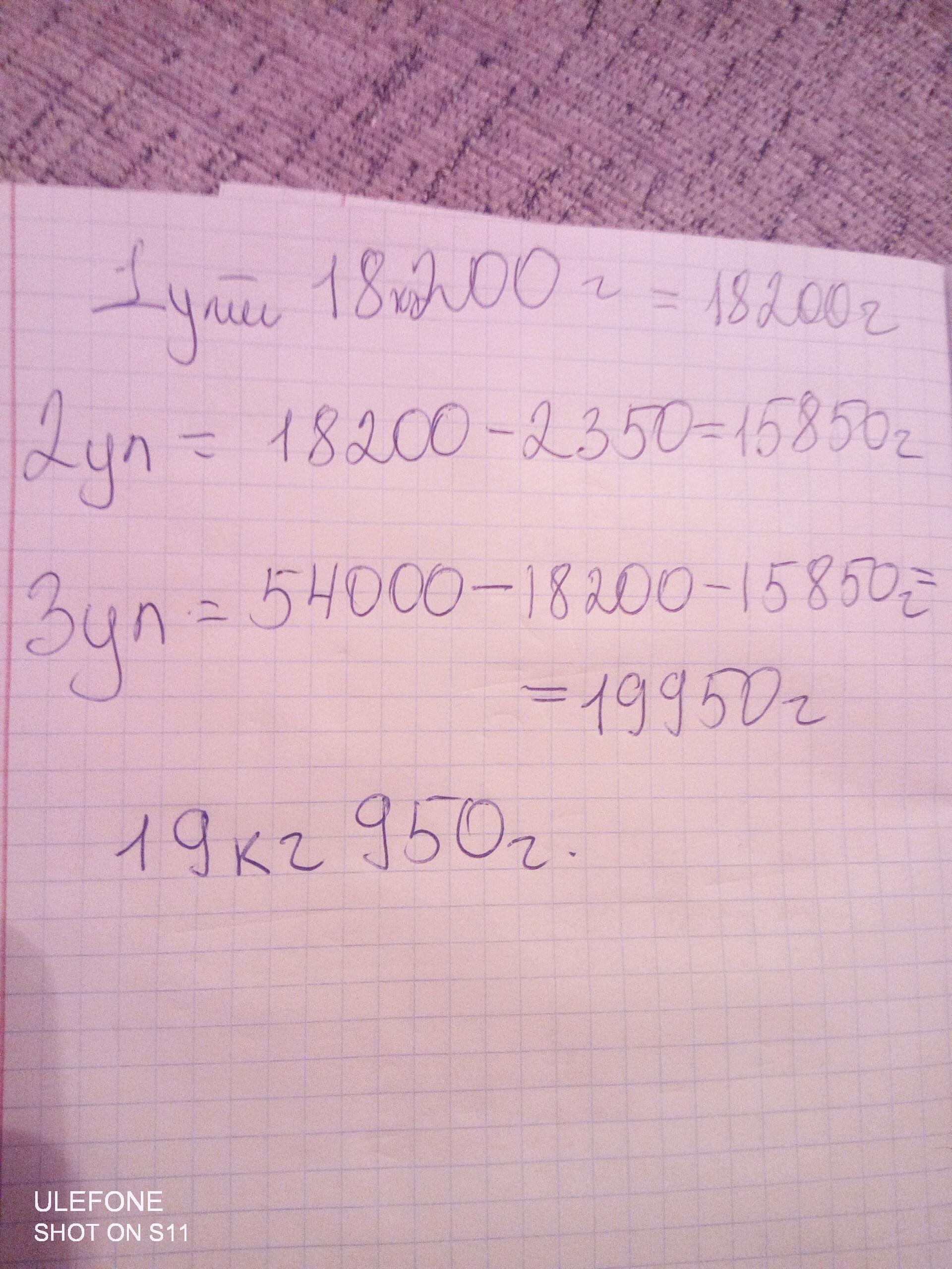 С трёх ульев собрали 54 кг 500 г мёда.с первого улья собрали 18кг200г мёда,со второго -на 2 кг 350 г меньше.сколько мёда собрали с третьего улья?