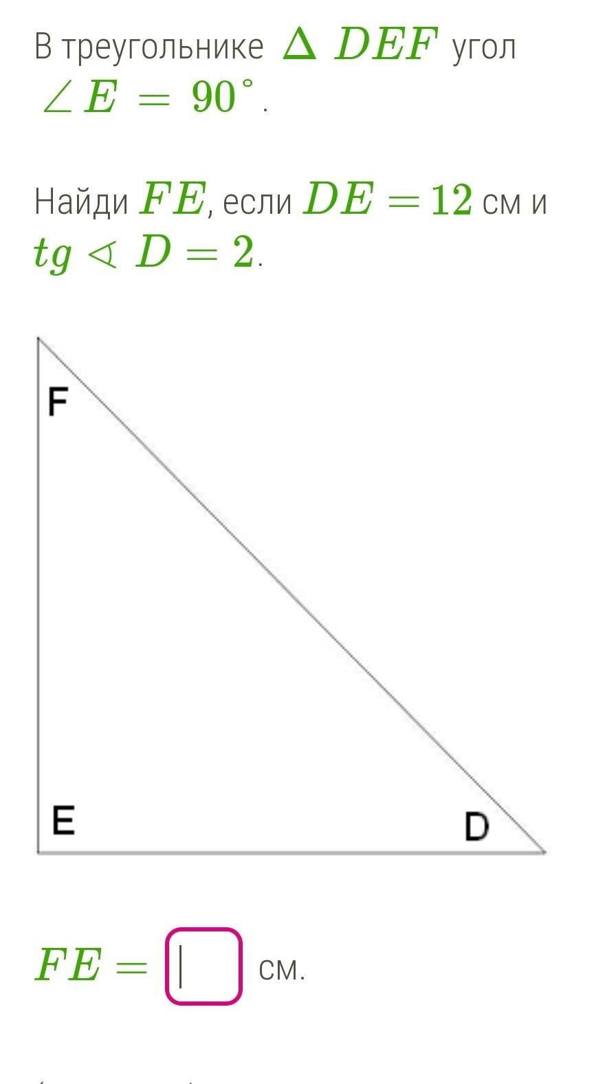 Тангенс угла есть отношение противолежащего катета к прилежащему. Отсюда FE/ED=2, ED=12 по условию, FE/12=2, FE=24