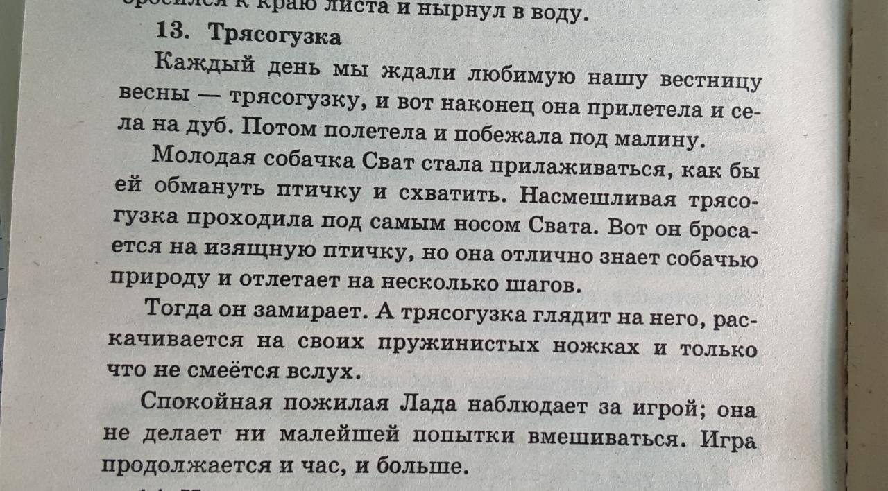 Мы ждали нашу любимую птицу - Трясогузку. И вот наконец она прилетела и улетела под куст малины. Наша собачка Сват хотела обмануть птичку и схватить её. Собака бросилась за птицей, но та улетела на несколько шагов. Собака замирает от грусти, а трясогузка глядит на него, раскачивается на своих пружинистых ножках