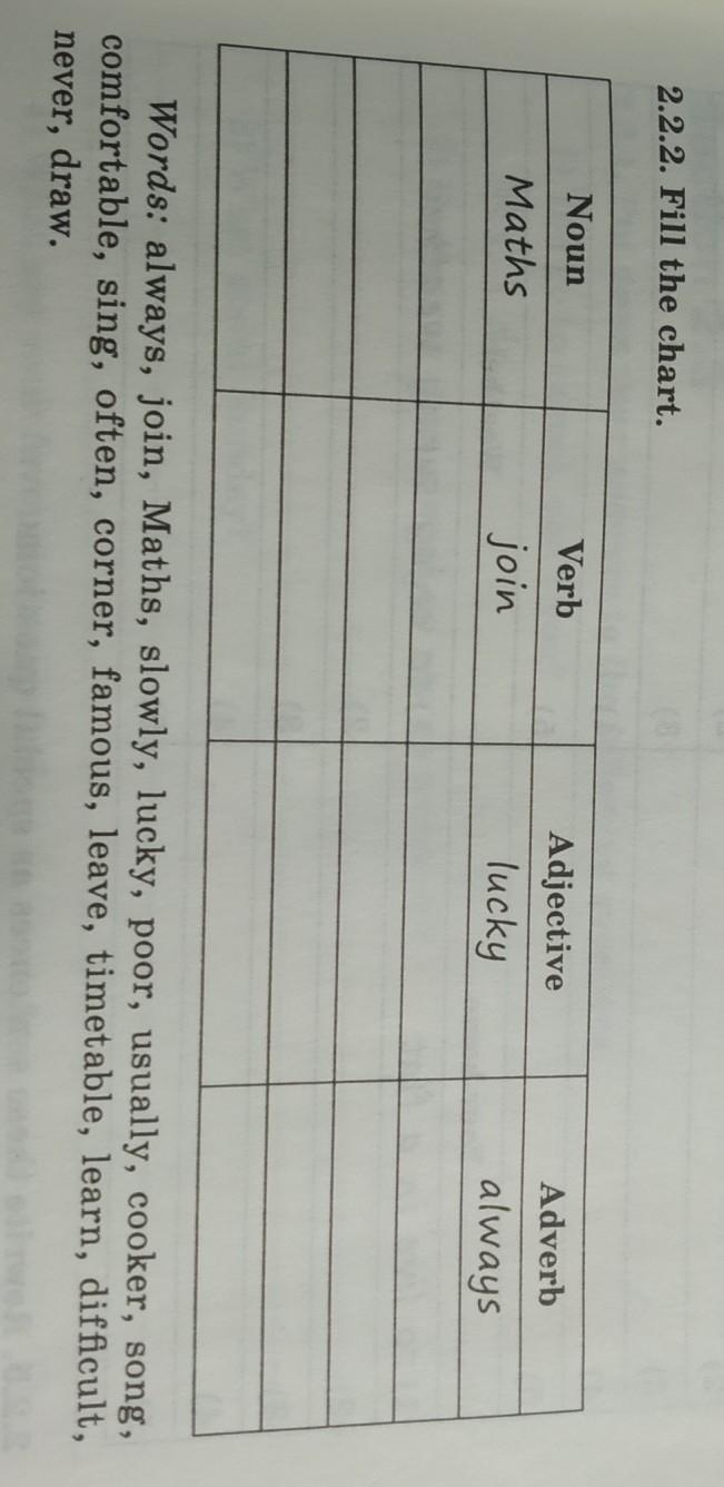 Words: always, join, Maths, slowly, lucky, poor, usually, cooker, song,