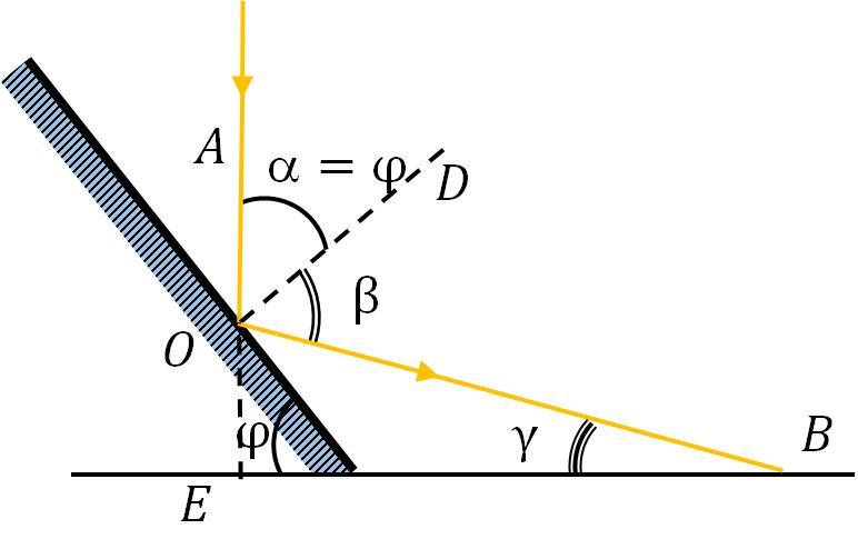 На дзеркало, розташоване під кутом 50° до горизонтальної поверхні столу, падає спрямований вертикально вниз промінь світла і підбивається. Який кут утворює відбитий промінь із горизонтом? Відповідь запишіть у градусах.