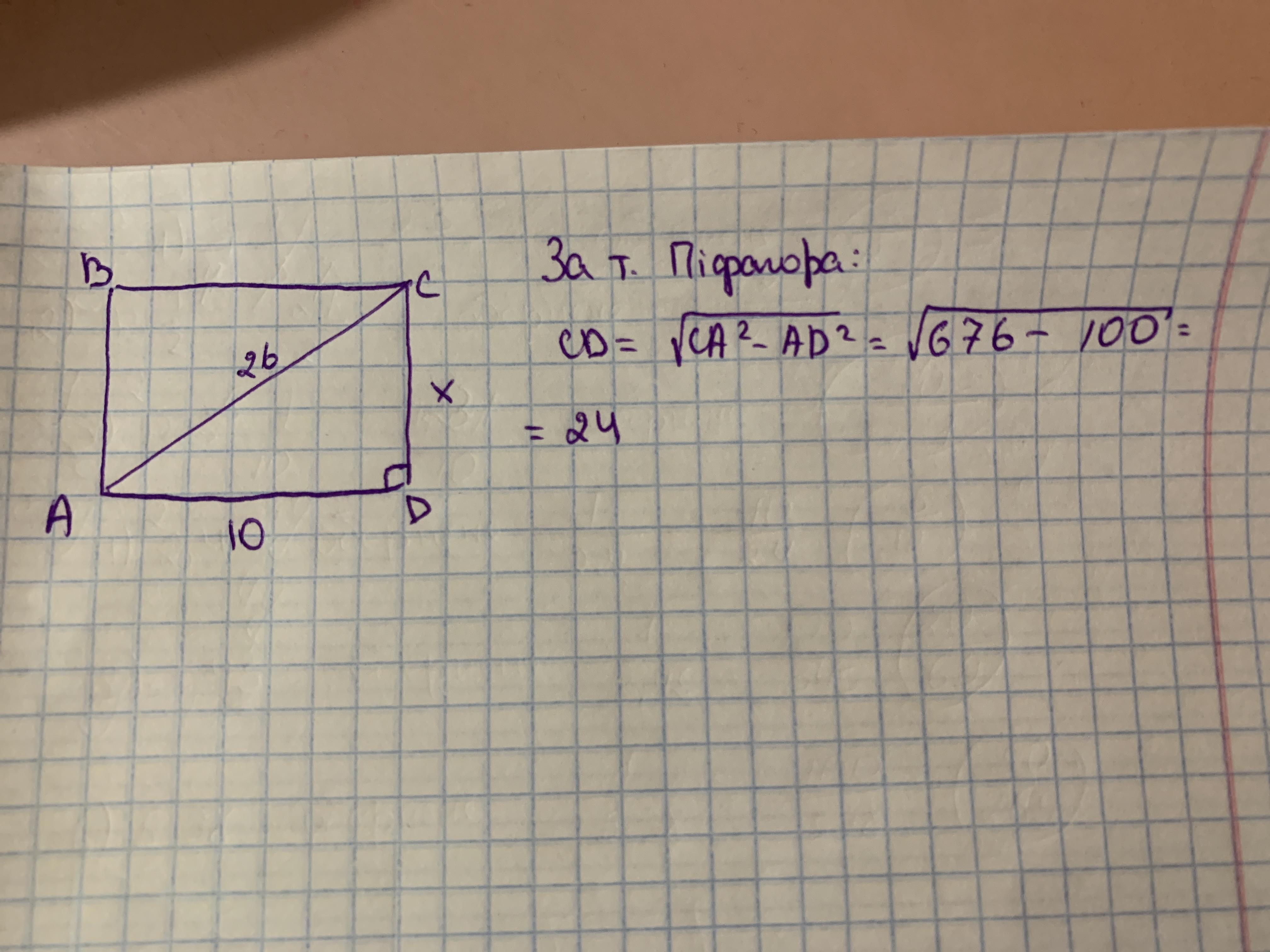 СD=√(AC²-AD²)=√(26²-10²)=√(676-100)=