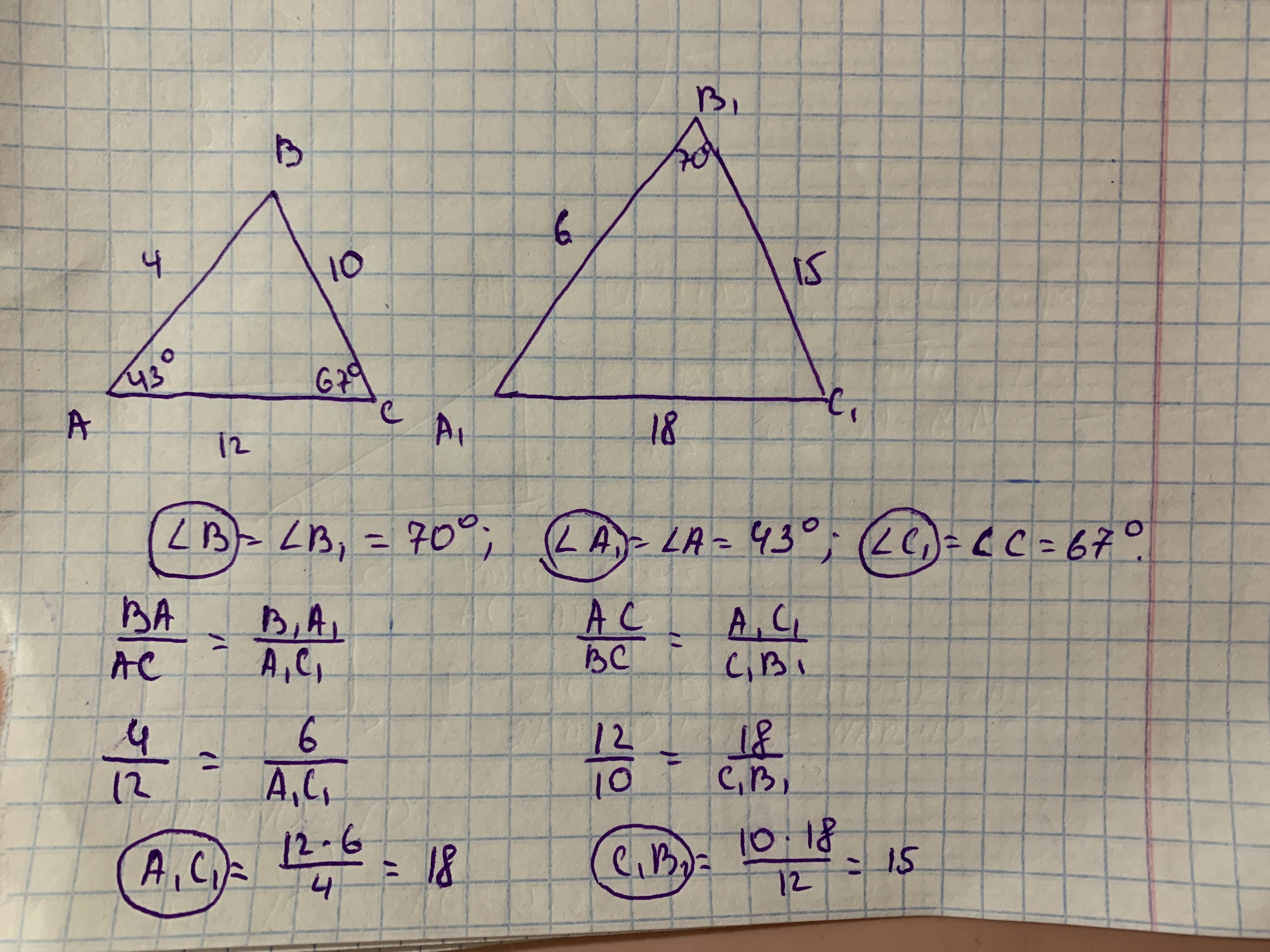 Ответ: <В=70; <А1=43; <С1=67;