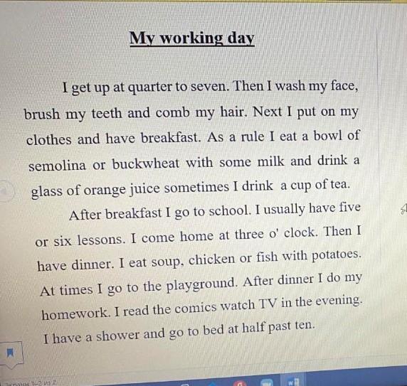 I wake up at half past seven. Then I get up, go to the bathroom where I brush my teeth, wash my face and get the shower. Next I go to the kitchen and have breakfast. As a rule I eat boiled egg, flakes with yogurt and drink black tea. Sometimes I drink fresh of apple juice or mineral water with lemon. After breakfast I go to school. I usually have six lessons. Every day I come home at two o'clock. Then I have a dinner. I eat pasta with ketchup, chicken or salmon. At times I go to the playground. After dinner I do my homework. Also I play computer games, read books or watch films in the evening. I have a shower and go to the bed at quarter to ten.