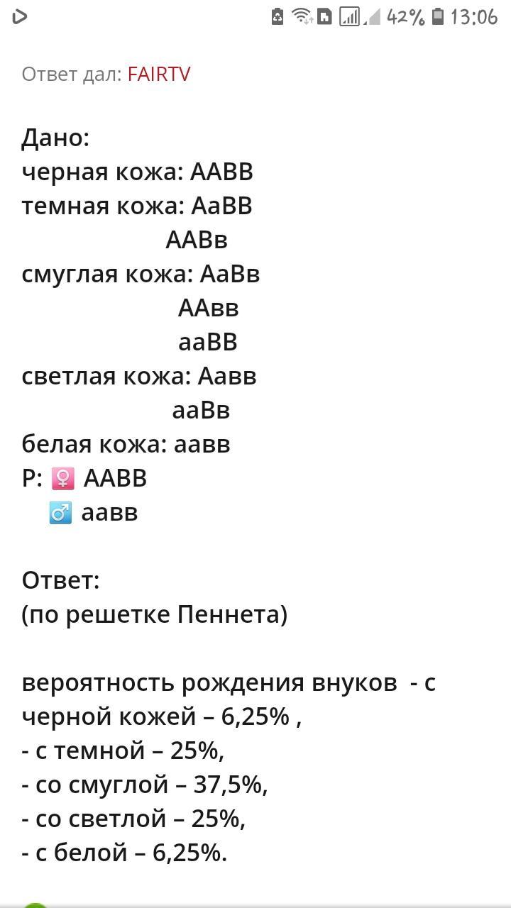 Цвет кожи человека определяется взаимодействием генов по типу полимерии: цвет кожи тем темнее, чем больше доминантных генов в генотипе: если 4 доминантных гена-кожа чёрная, если 3-темная, если 2 смуглая, 1-светлая, если все гены в рецессивном состоянии-белая. Мужчина со смуглой кожей женился на женщине со светлой кожей. 6/8 часть детей в этой семье родились со смуглой и светлой кожей, 2/8 часть с темной и белой кожей. Определите генотипы родителей.
