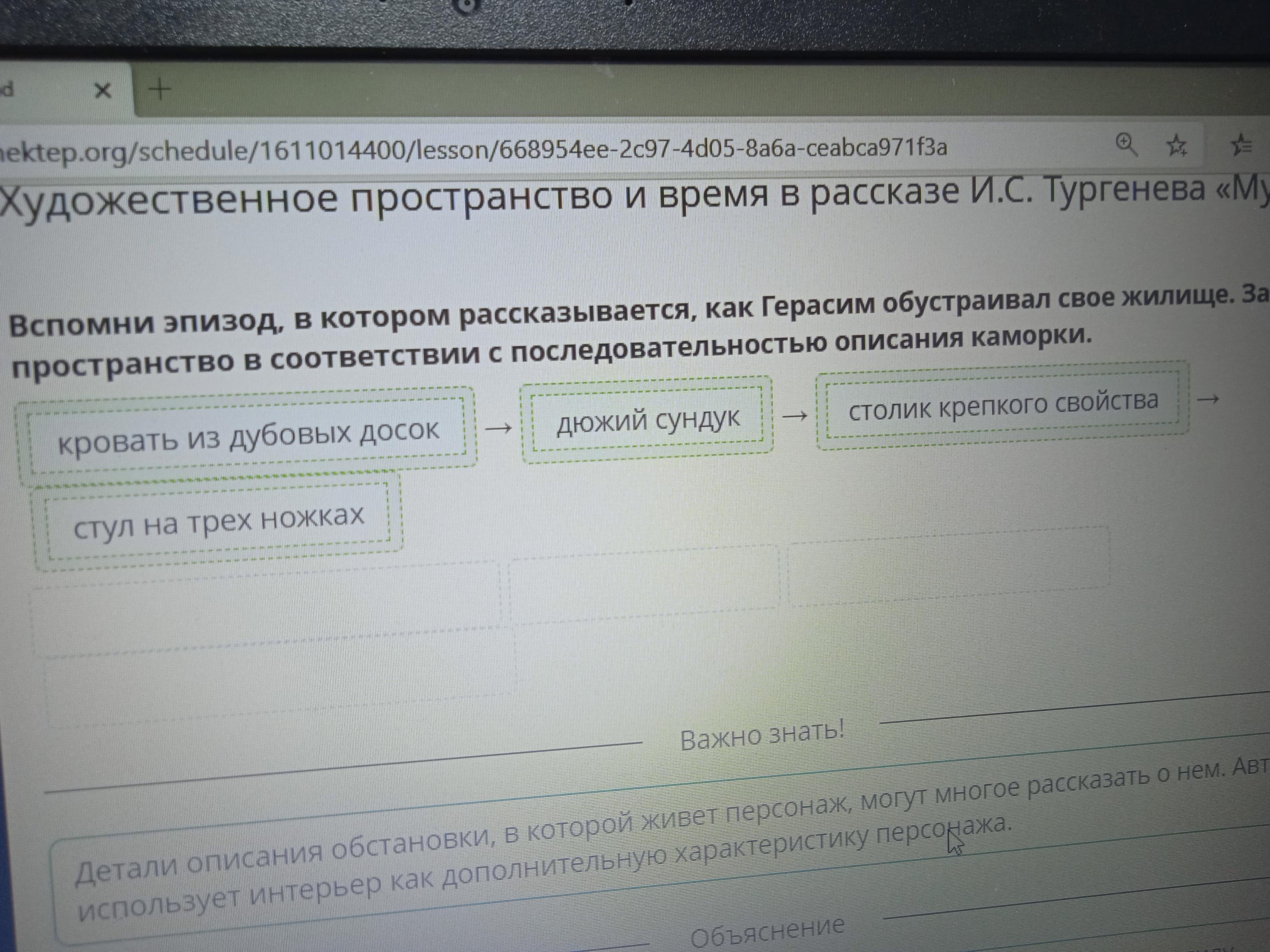 Вспомни эпизод, в котором рассказывается, как Герасим обустраивал свое жилище. Заполни