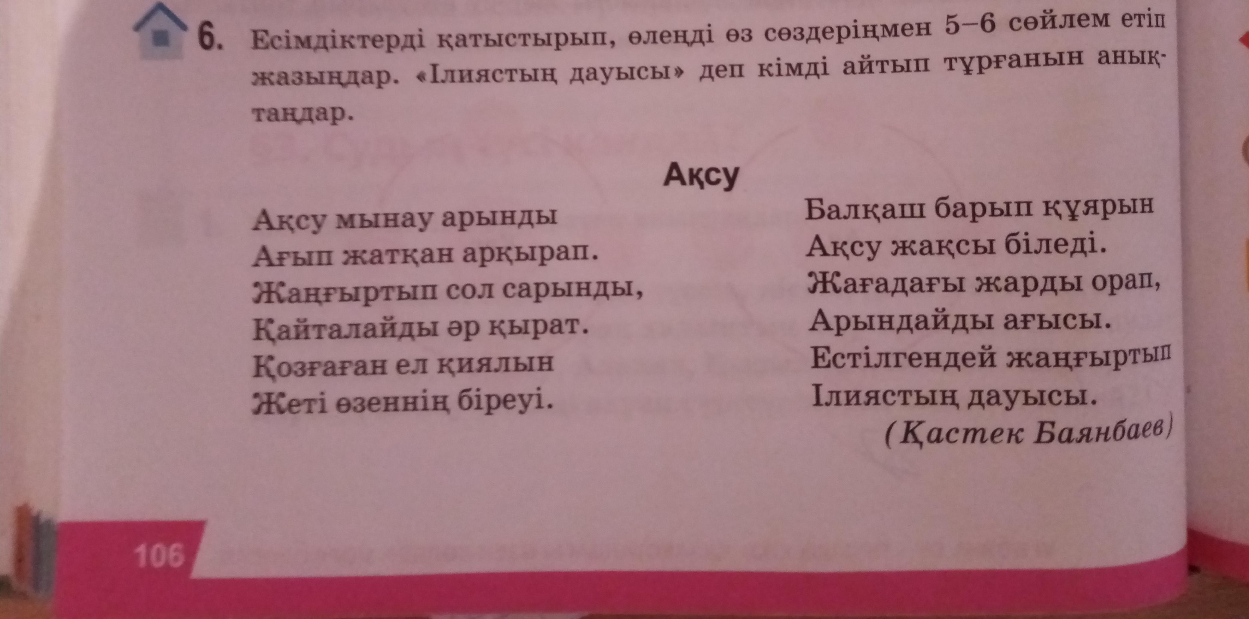 Есімдіктерді қатыстырып өлеңді өз сөздеріңмен 5 6 сөйлем етіп жазыңдар. "Ілиястың дауысы" деп кімді айтып тұрғанын анықтаңдар.