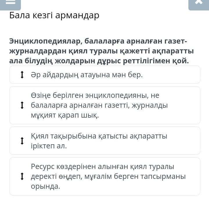 Энциклопедиялар,балаларға арналған газет-журналдардан қиял туралы қажетті ақпаратты ала білудің жолдарын дұрыс ретінде қой.