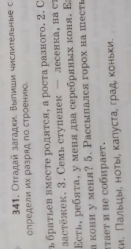 341. Отгадай загадки. Выпишите числительные с существительные, определи их разряд по строению.