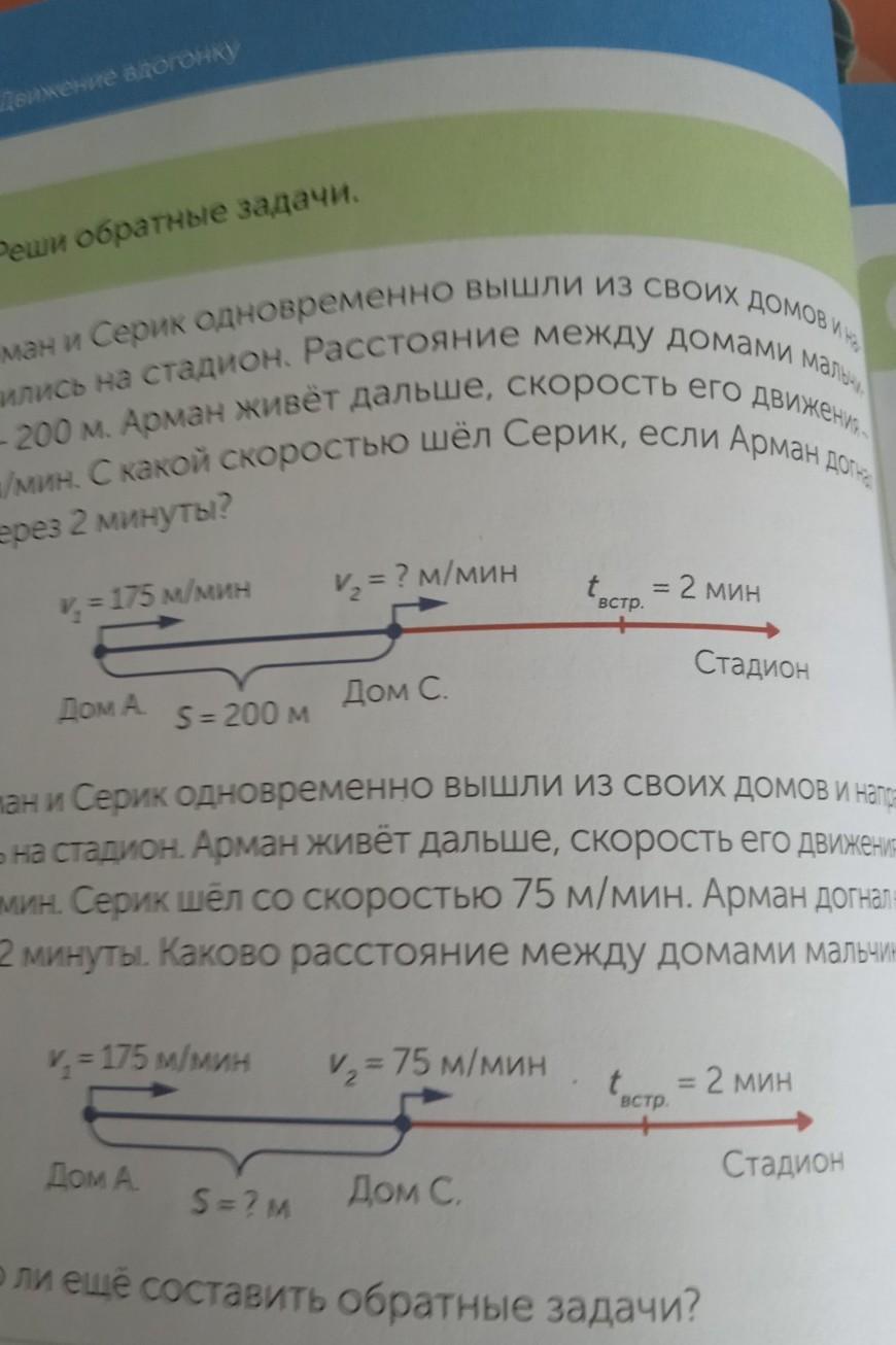Арман истерика одновременно вышли из своих домов и направились на стадионе расстояние между домами мальчиков 200m Арман живёт Даша скорость его движения 175 м в минуту С какой скоростью шёл вперёд если Арман догнал его через 2 минут написать условия