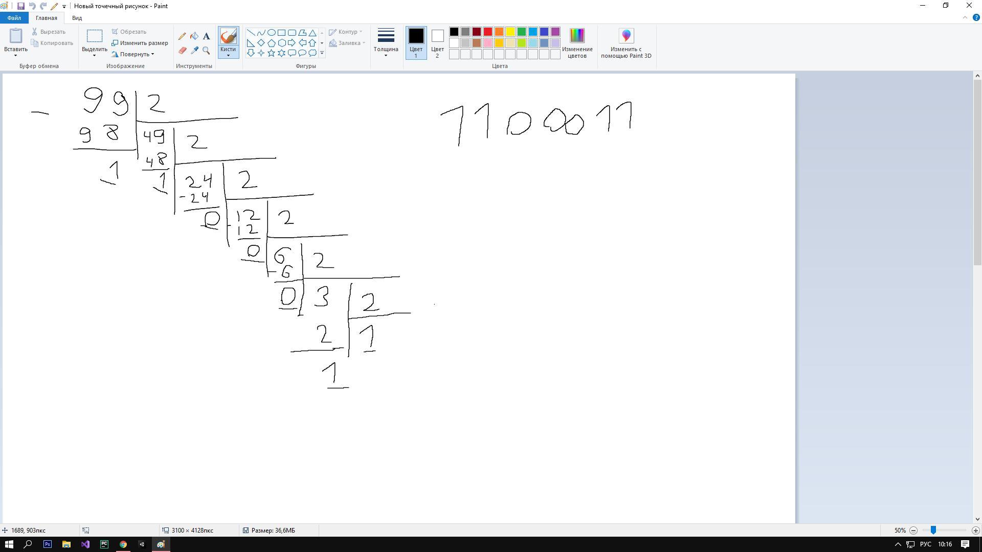 Переведите целое число 99 из десятичной системы счисления в двоичную. С решением в столбик.