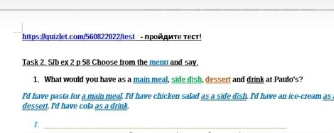 I would have pizza for the main meal, I would have fish as a side meal, I would have a cake as a dessert, I would have juice as a drink.