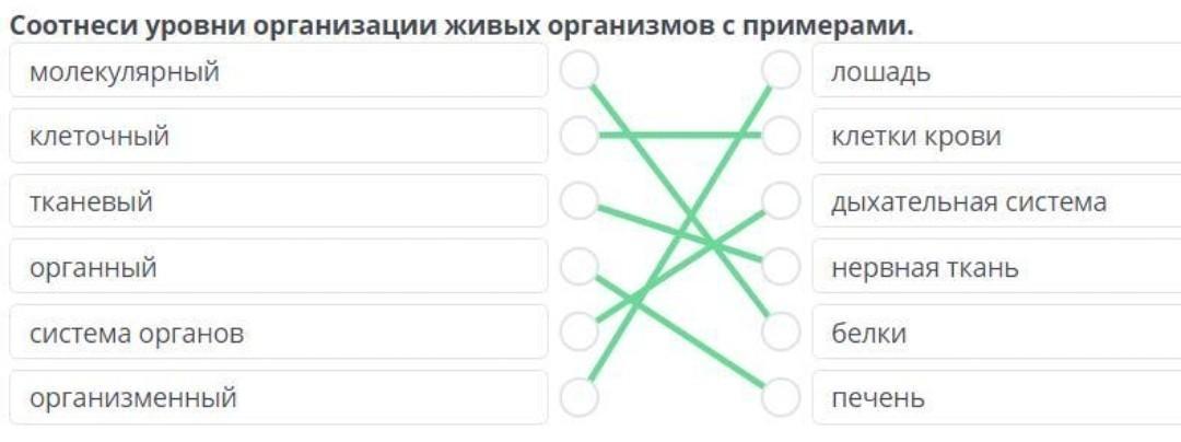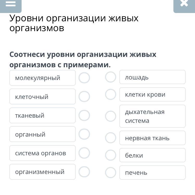 Молекулярный-белки клеточный-клетки крови тканевый-нервная ткань органный- печень система органов-дыхательная сестема организменный - лошадь
