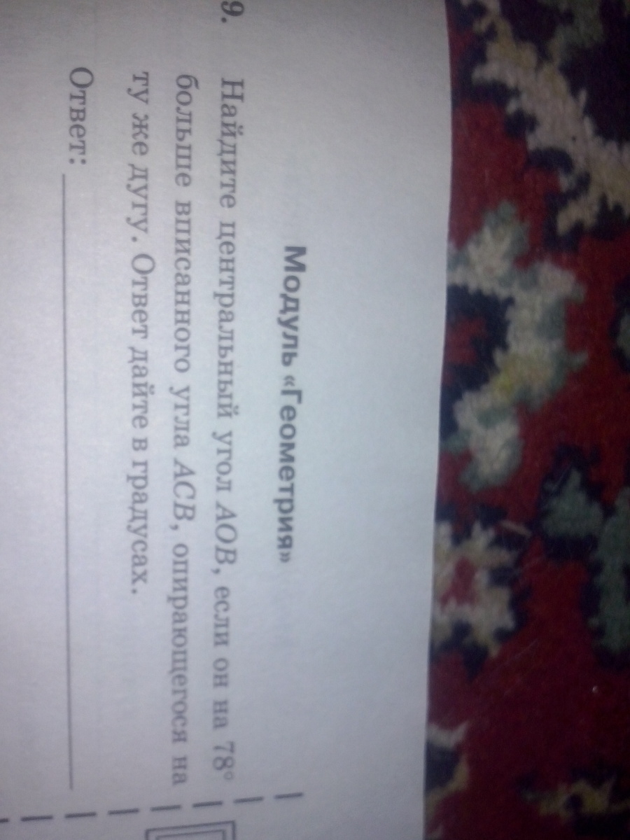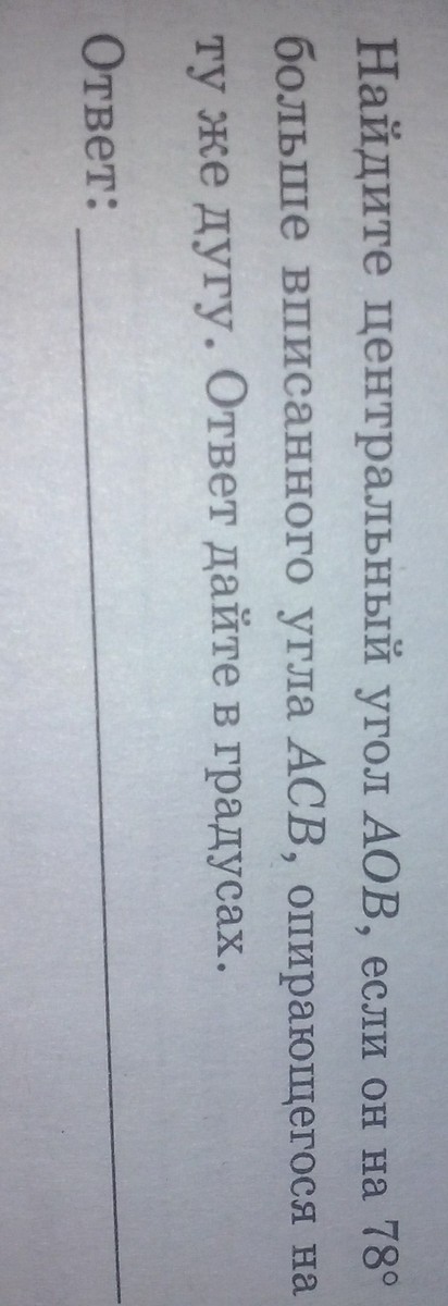 Найдите центральный угол AOB если оно 78 градусов больше вписанного угла ACB опирающиеся на одну и ту же дугу. ответ дайте в градусах