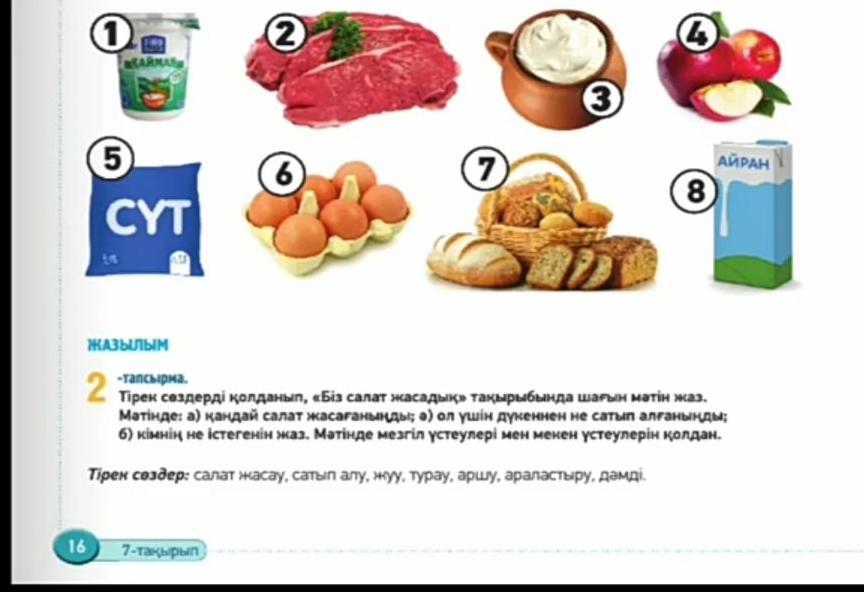 Ответ:Біз Маржан, Аружан үшеуміз таңертең Оливье салатын жасадық. Аружан дүкеннен салатқа қажет заттарды: картоп, майонез, ас көк, жұмыртқа, колбаса, горох сатып әкелді. Бірінші біз картопты жуып,жұмыртқамен бірге суға пісіріп алдық. Содан соң Маржан суға піскен картоп, жұмыртқаның сыртқы қабықтарын аршыды . Мен салат өнімдерін картоп, жұмыртқа кубик кып турадым. Аружан колбасаны турап бәрін бір ыдысқа салып устине горох және майеноз куйып,тұз сеуіп араластырдык. Біздің салатымыз дайын және өте дәмді болды.