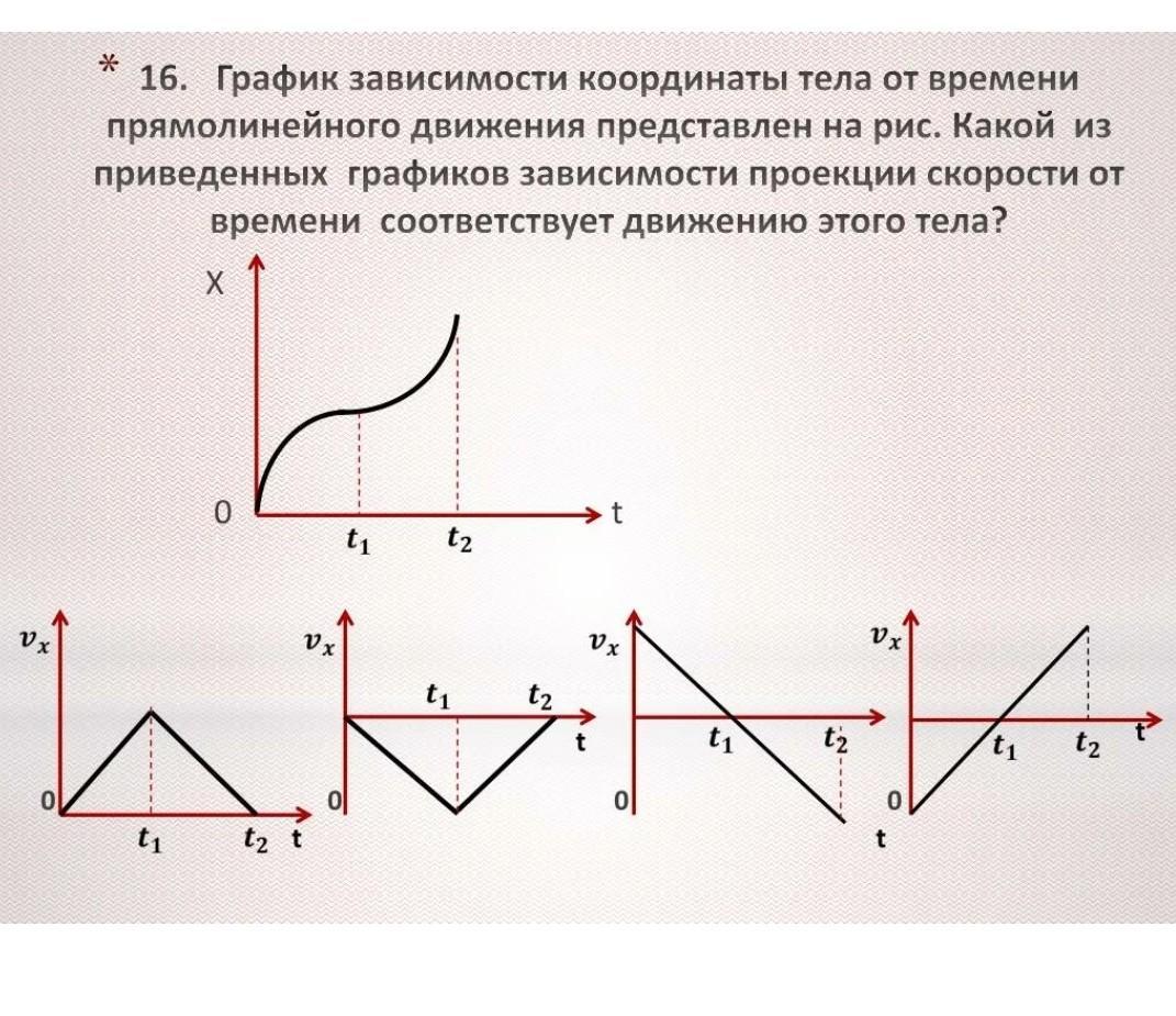 Сначала скорость падает (за равные промежутки времени промежутки пройденного пути уменьшаются), После момента t1 скорость возрастает (за равные промежутки времени участки пройденного пути увеличиваются).