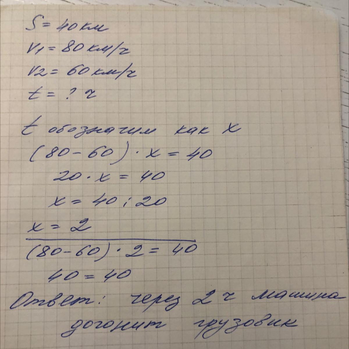 Реши как уравнение. Расстояние между посёлками А и Б–40 км. Из посёлка А выехал легковой автомобиль со скоростью 80 км/ч, а из посёлка Б–одновременно грузовик со скоростью 60 км/ч. Через сколько часов легковая машина догонит грузовик