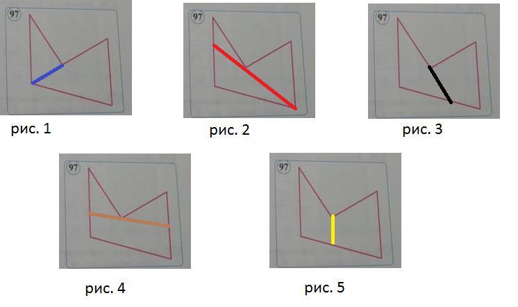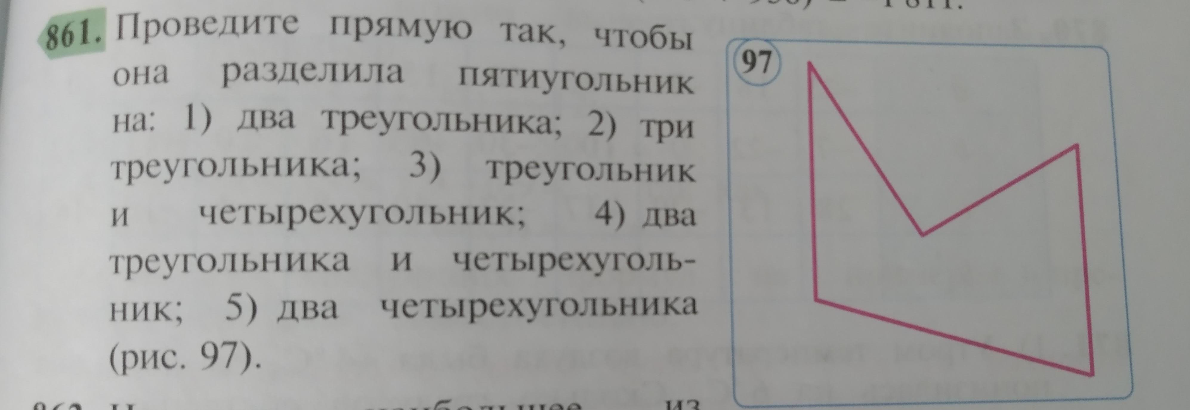 Проведите прямую так, чтобы она разделила пятиугольник на 1) два треугольника; 2) три треугольника; 3) треугольник и четырехугольник ; 4) два треугольника; 5) два четырёхугольника ( рис.97).