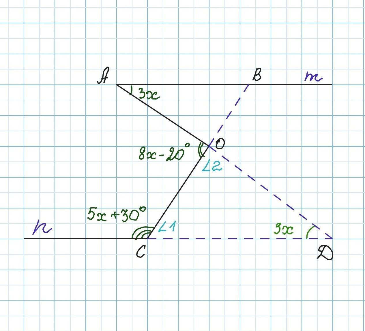 ∠CDO =∠ВАО = 3х, как внутренние накрест лежащие углы при параллельных прямых m и n и секущей AD.