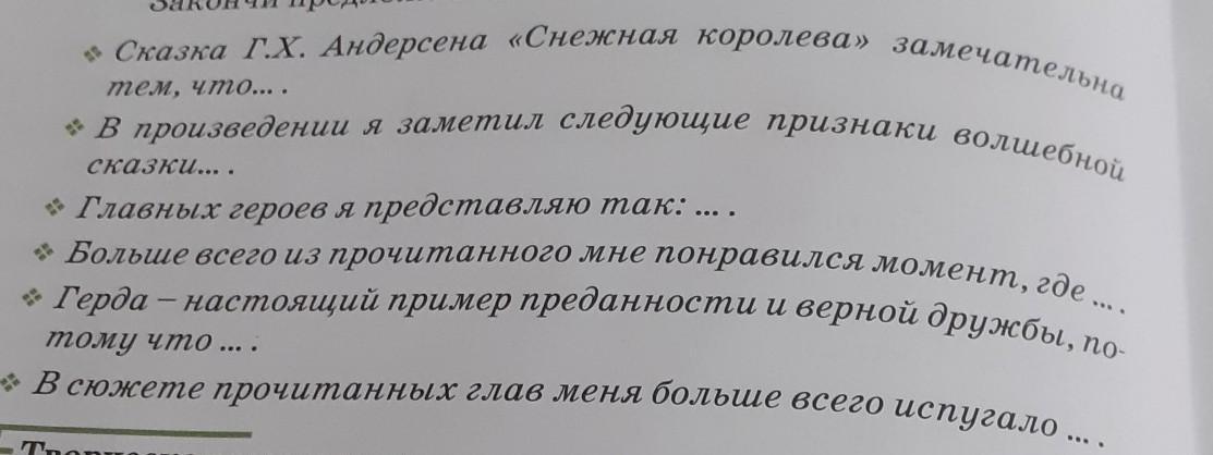 Потому что в сказке звери разговаривали 3) я их представляю лутчеми друзьями 4) где Герда пошла искать кая 5) потому что Герда в тяжёлый момент некогда не бросит в в тяжёлые времена 6) меня испугала что Герда не найдёт кая .