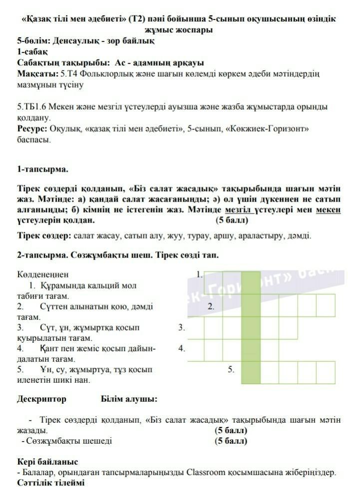 Мен анаммен бүгін дүкенге барып азық-түлік алып келдік. анам кешкі тамаққа оливье салаттын жассайық деді. Салат жасау үшін көкеністерді жуу, аршу, турау, керек. Оливье салатына шұжық, бұршақ, қайнатылған картоп, қайнатылған жұмыртқа, майонез. Ең соңында оларды араластырамыз.