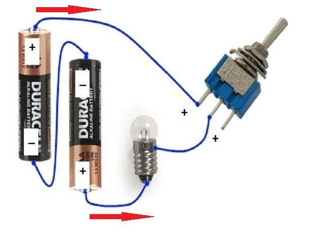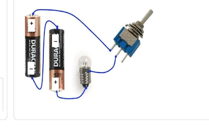 Катя предложила Марку собрать цепь с двумя одинаковыми только что купленными батарейками, чтобы получить более сильный электрический ток. Но вначале она решила проверить, будет ли в такой цепи ярче гореть лампочка. Собранная Катей цепь показана на рисунке. Она замкнула цепь переключателем.
