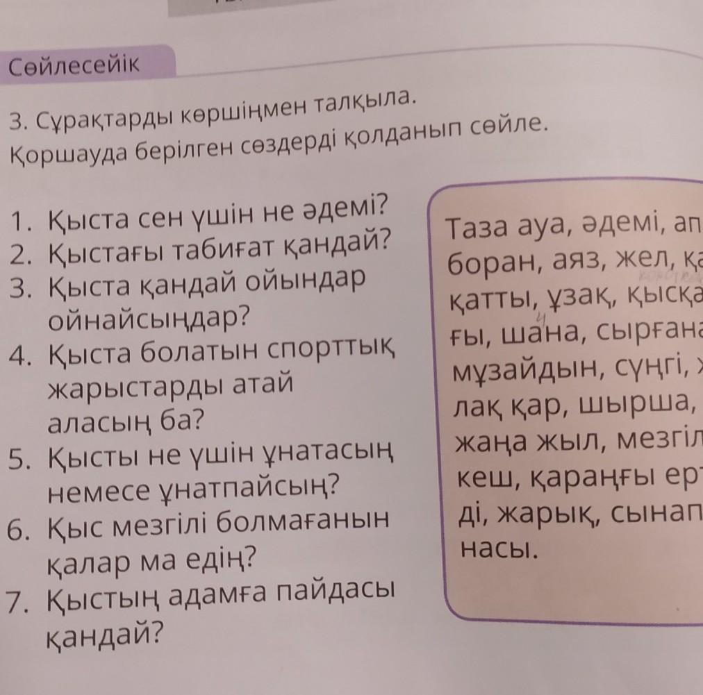 5) қысты мен кейде ұнатамын кейде ұнатпаймын. Өйткені ұнатпайтын себебім дала суық болады, ұнататын себебім көп қызықтар болады: аққала жасау т. б