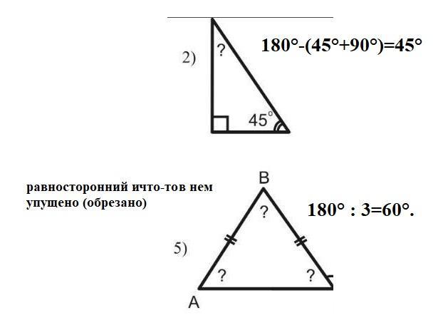 2) угол равен 45° т.к. сумма длин сторон треугольников 180°, следовательно 180°-45°-90°=45°