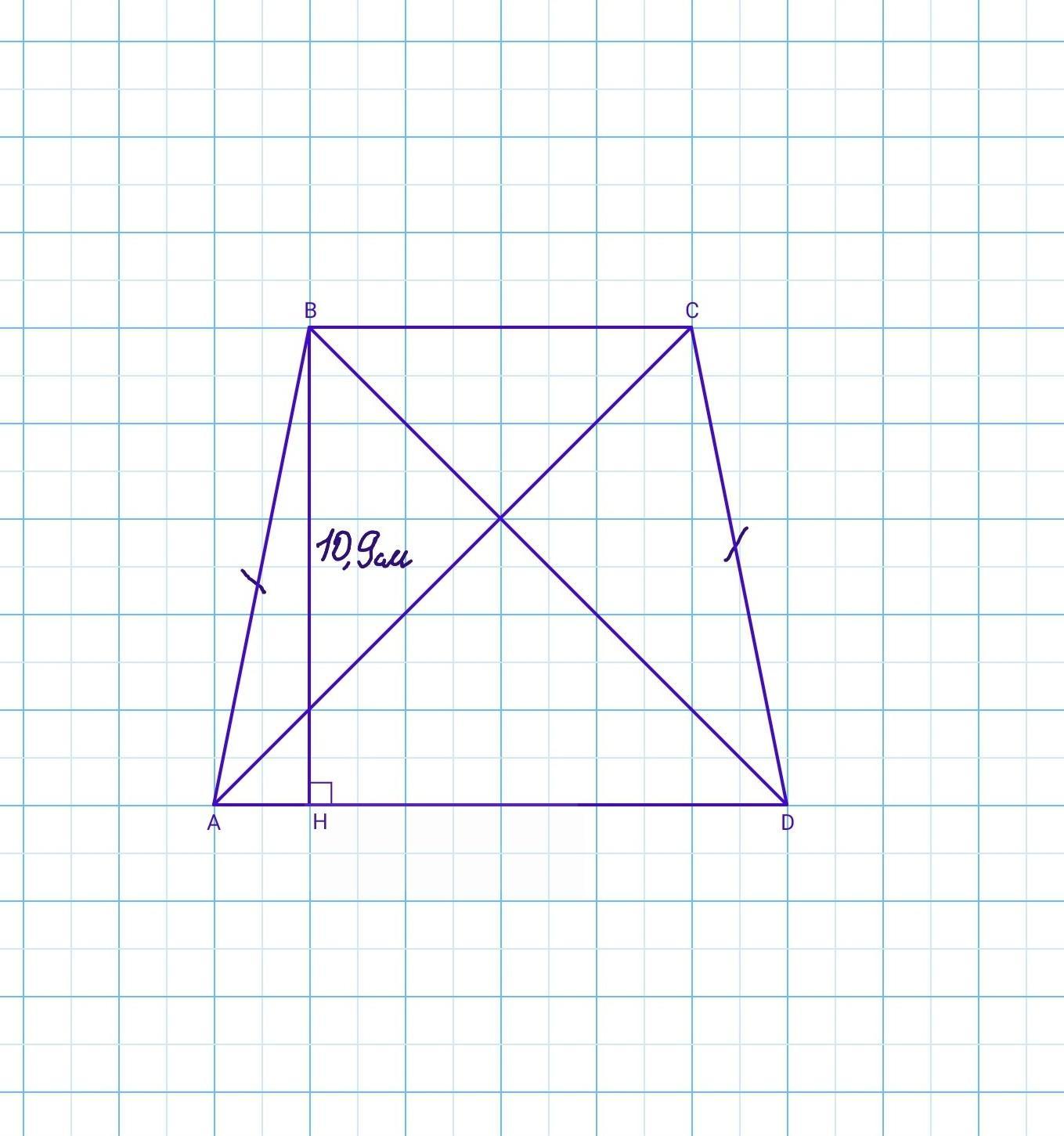 Дано: ABCD - трапеция. АВ=CD (так как боковые стороны равнобокой трапеции равны). BH - высота. ВН⟂AD. BH = 10,9 см. Р(ABCD) = 48 см