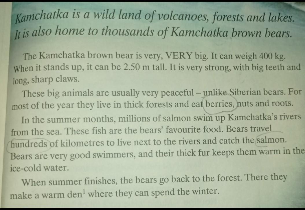 The Kamchatka brown bear can weigh 400 kg and be 2.50 m tall so this animal is really big. It is very strong because it has big teeth and sharp claws. These animals are quite peaceful. They usually live in thick forests and eat berries, nuts and roots.