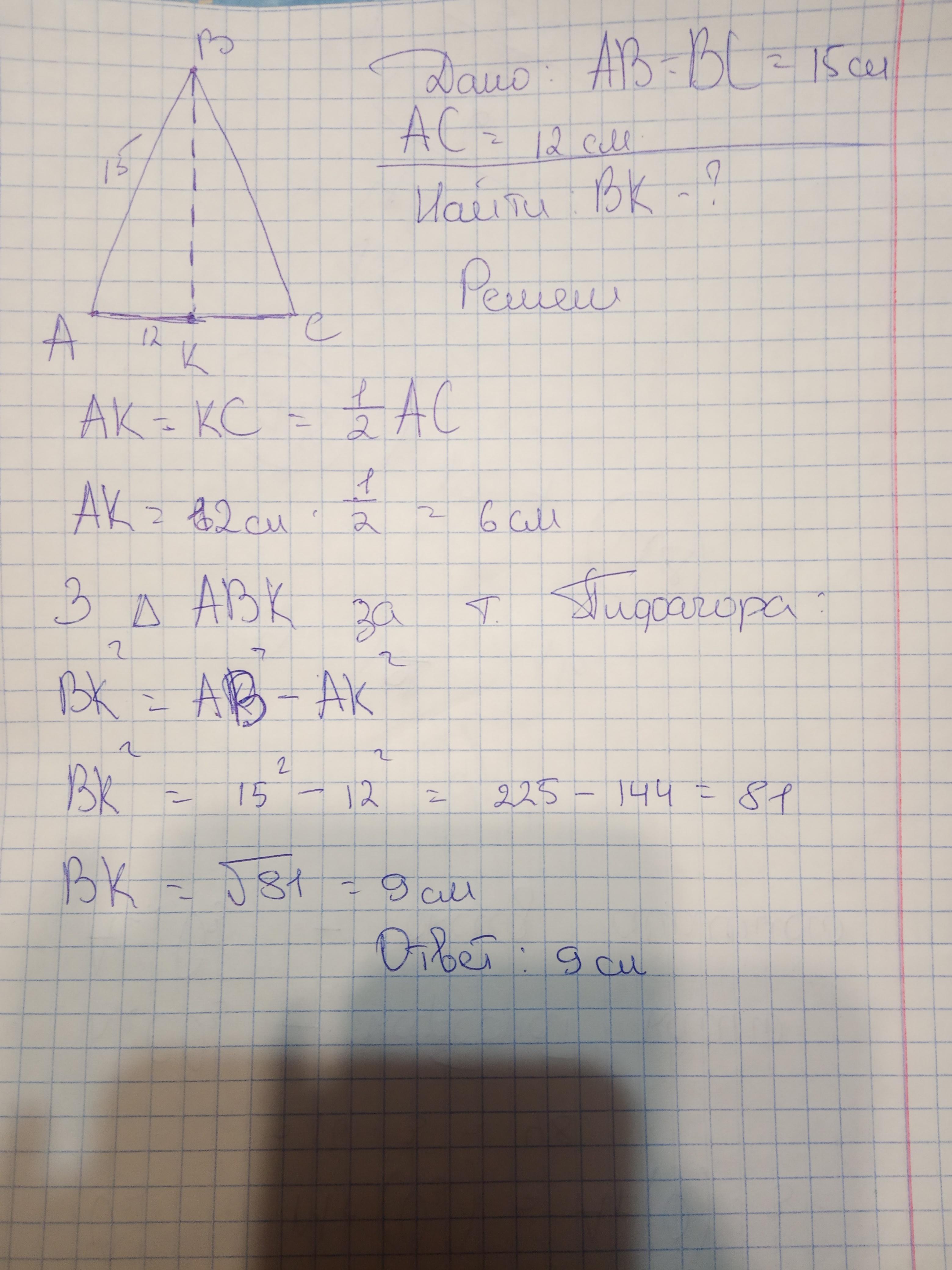 НС=15^2-12^2=225-144=корень из 81= 9см