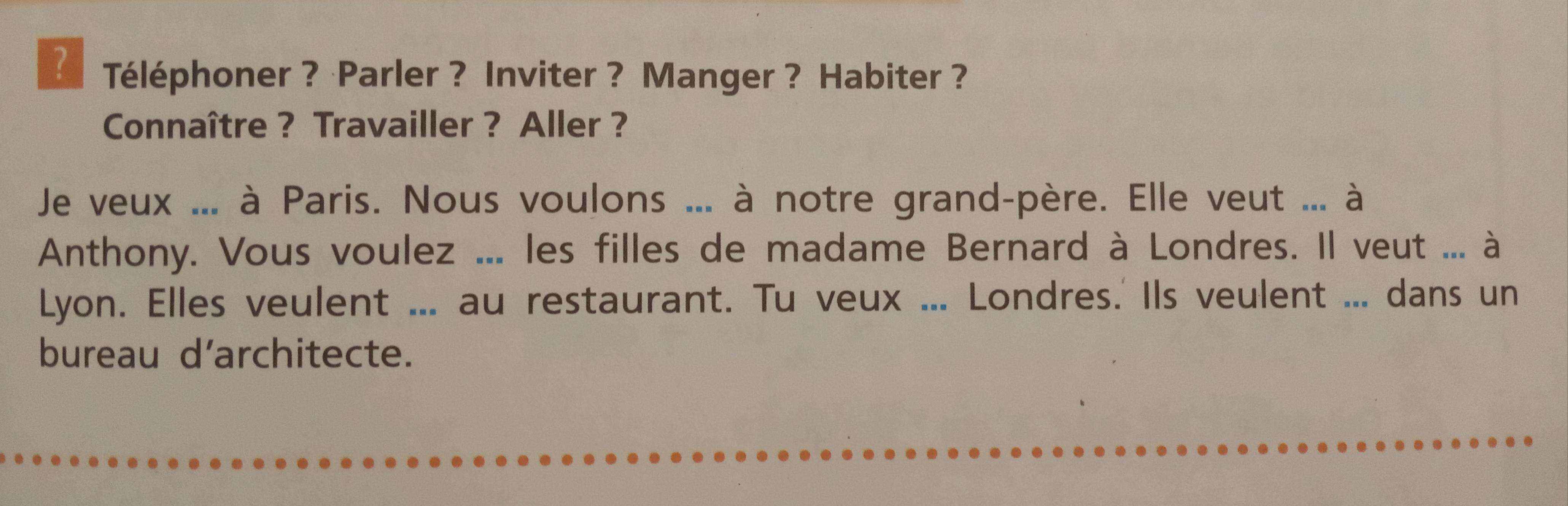 Je veux habiter à Paris.Nous voulons telephoner à notre grand-père.Elle veut parler à Anthony.Vous voulez inviter les filles de madane Bernard à Londres.Il veut aller à Lyon.Elles veulent manger au restaurant.Tu veux connaître Londres.Il veulent travailler dans un bureau d'architecte.
