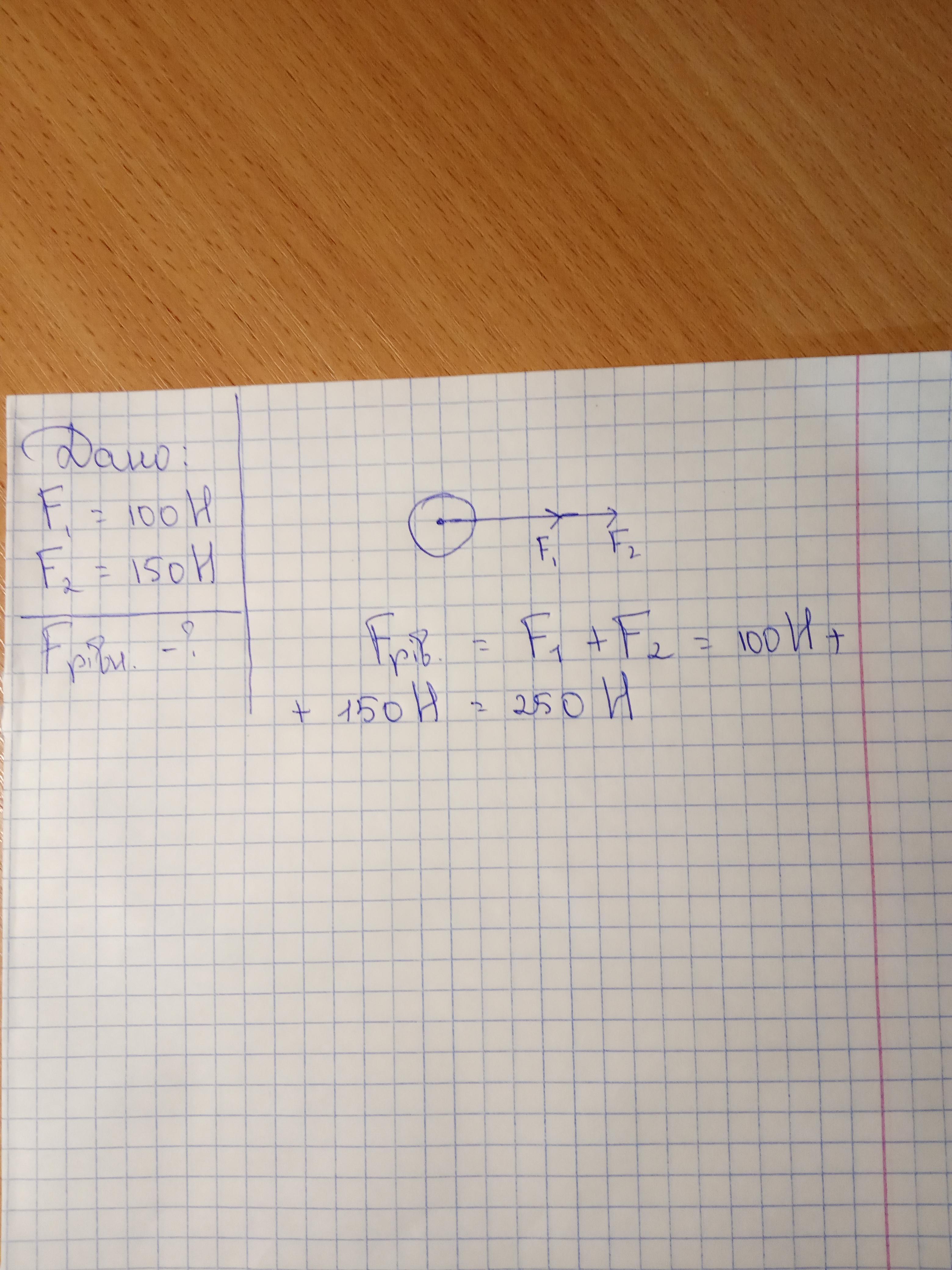 Рівнодійна цих сил дорівнює сумі цих двох сил, тобто 250 Н. Якщо б сили були спрямовані протилежно ( вектори сил були під кутом 180 градусів) то рівнодійна дорівнювала різниці цих сил.
