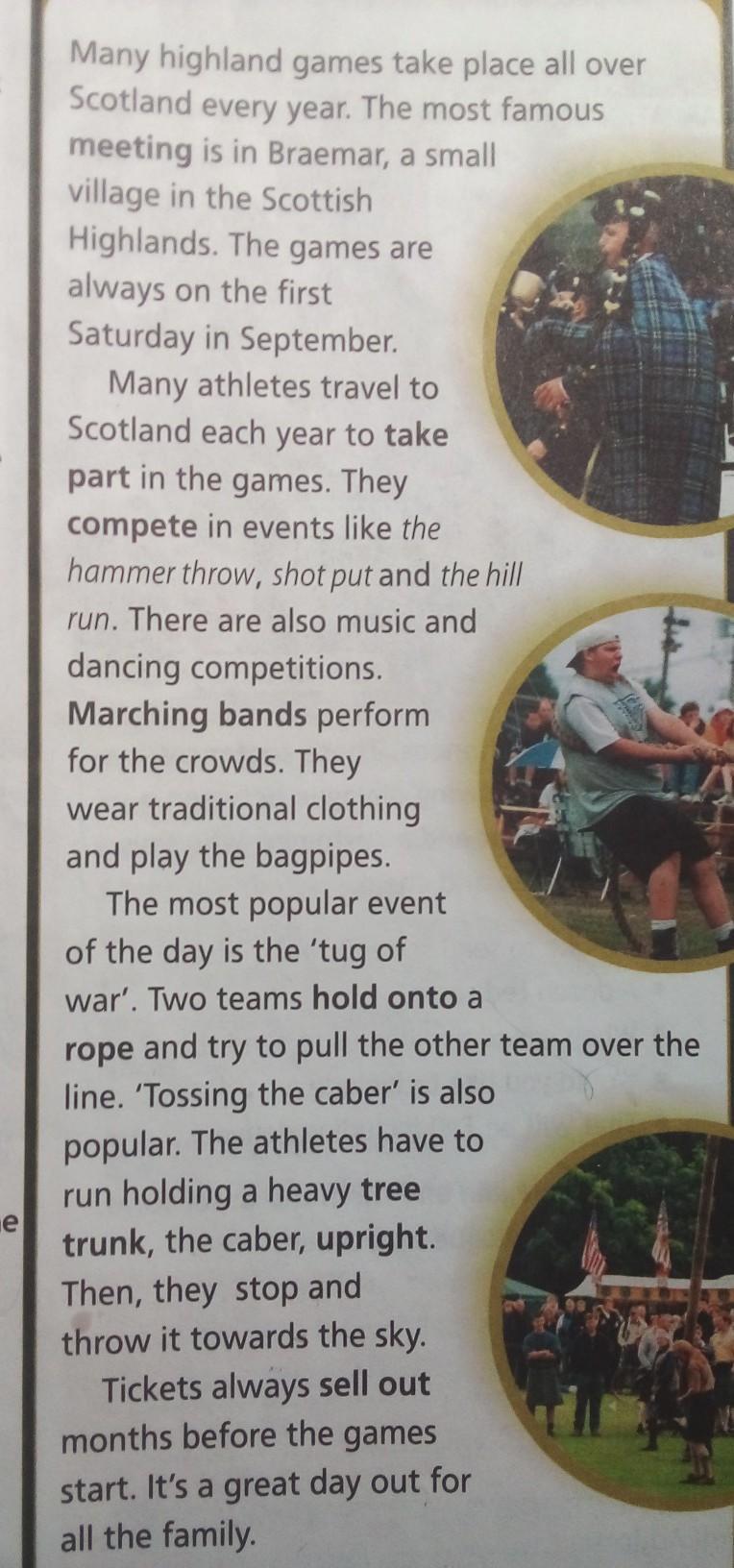 Многие горные игры проводятся по всей Шотландии каждый год. Самая известная встреча происходит в Бремаре, небольшой деревне в Шотландском нагорье. Игры всегда проходят в первую субботу сентября. Многие спортсмены ежегодно приезжают в Шотландию для участия в играх. Они соревнуются в таких соревнованиях, как метание молота, толкание ядра и бег по холмам. Также проходят музыкальные и танцевальные конкурсы. Для толпы выступают марширующие оркестры. Они носят традиционную одежду и играют на волынке. Самое популярное событие дня - перетягивание каната. Две команды держатся за веревку и пытаются вытащить другую команду за линию. Также популярно «Перебрасывание кабера». Спортсмены должны бежать, держа в вертикальном положении тяжелый ствол дерева - кабер. Затем они останавливаются и бросают его в небо. Билеты всегда распродаются за несколько месяцев до начала игр. Это отличный день для всей семьи.