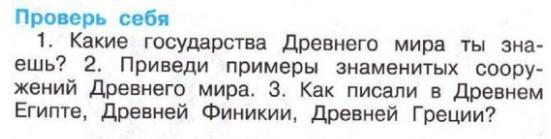 1.греция, палестина, персия, финикия, мальта. 2.Великая китайская стена,Великая Пирамида в Гизе. 3.В Древнем Египте писали иероглифами (иероглифы это значки рисунки). Иероглифов было несколько тысяч, запомнить их было нелегко и было мало грамотных людей. В Древней Финикии жители занимались торговлей, необходимо было вести записи, поэтому придумали алфавит. В алфавите у финикийцев были только согласные буквы. В Древней Греции алфавит дополнили гласными буквами.