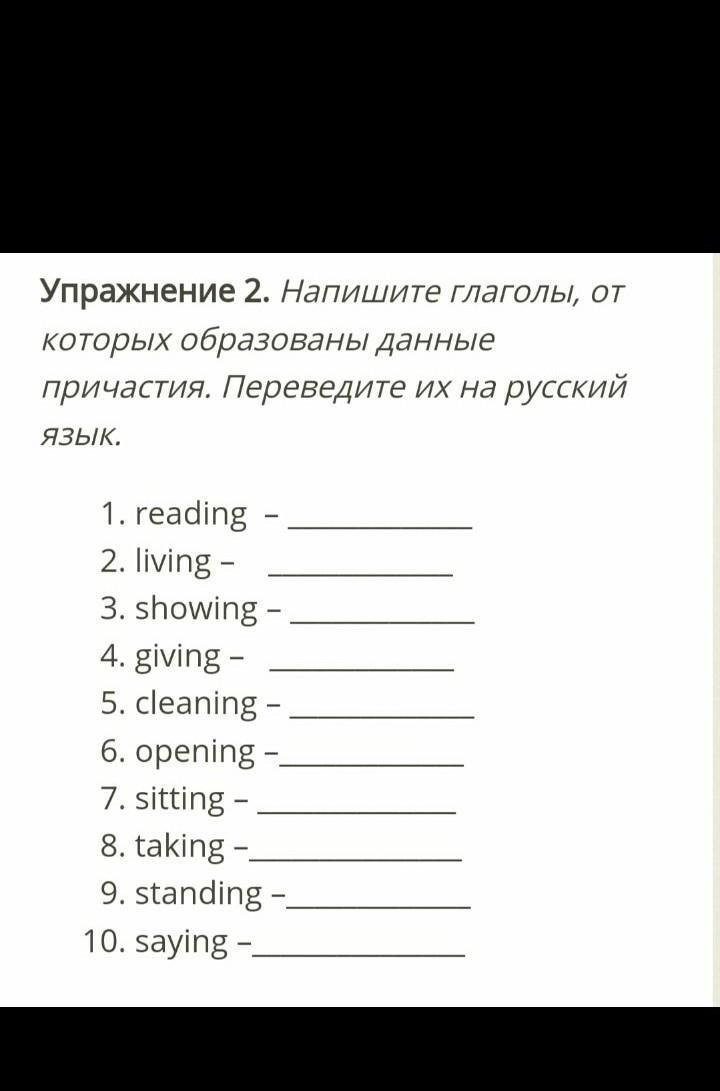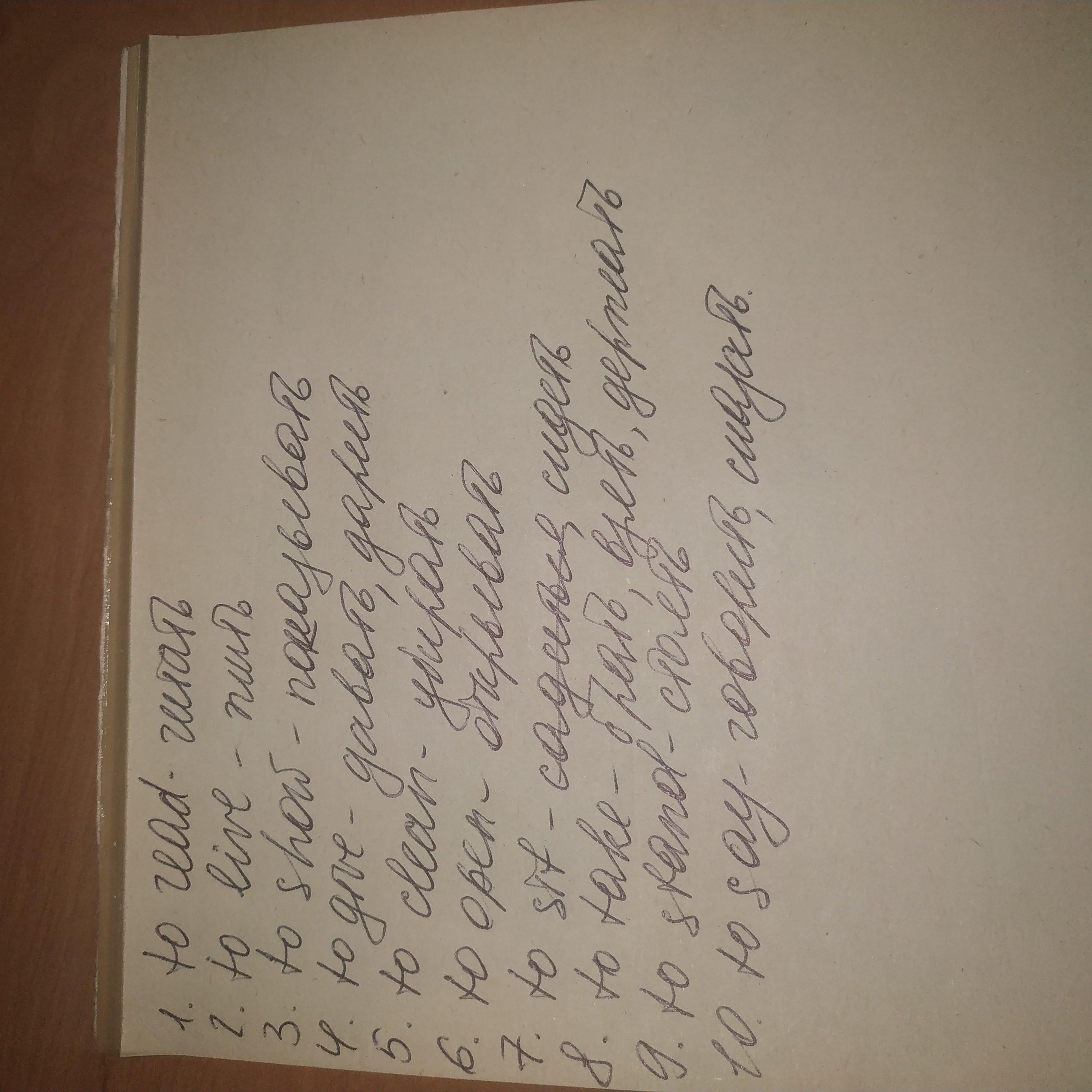 Read-читать, Live-жизнь, show-показывать, give-дать, clean-чистый, open-открыть, sut-сидеть, take-брать, stand-стоять, say-говорить
