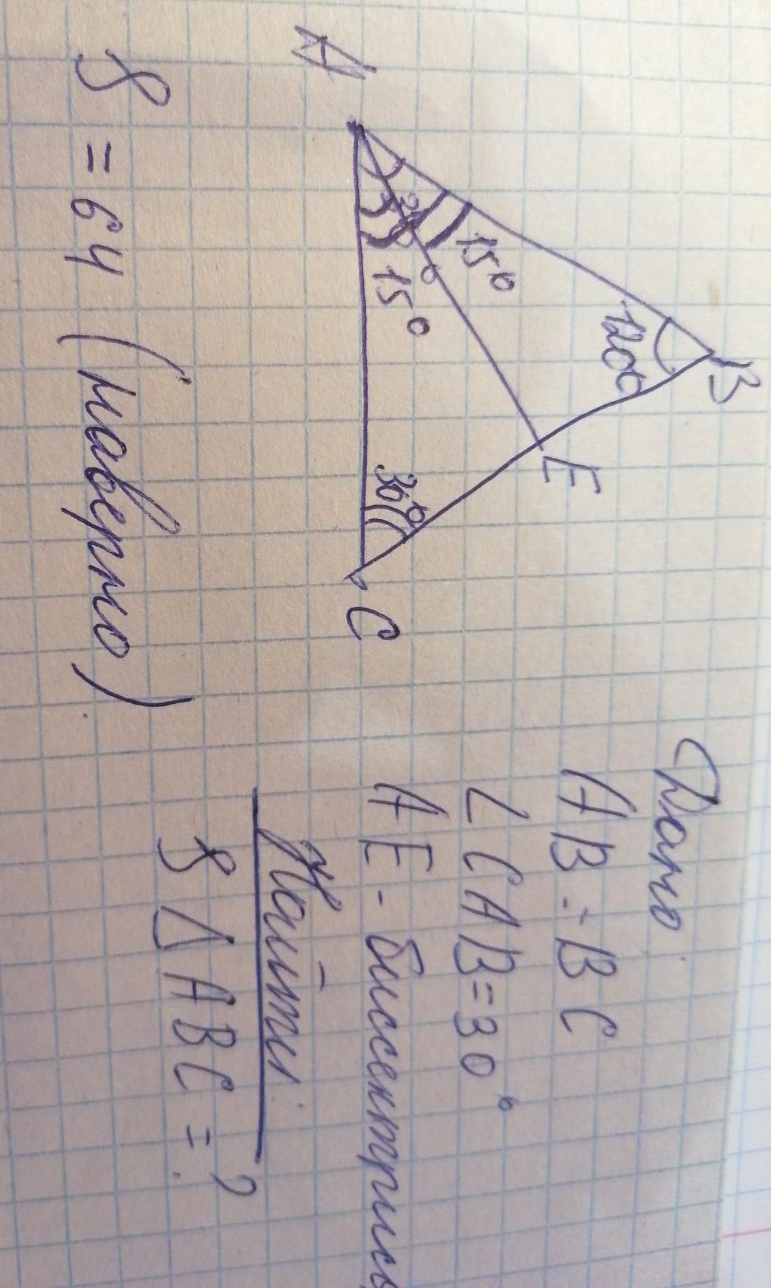 В треугольнике ABC AB=BC, угол CAB=30,AE-биссектриса, BE=8 см.Найдите площадь треугольника АBC