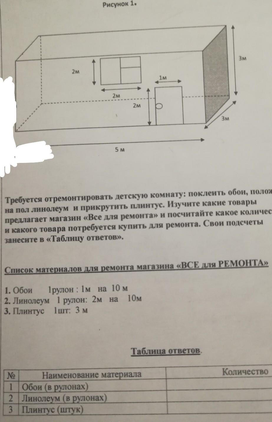ищем периметр = 5+3+5+3=16 метров, отнимаем 1 метр (дверь), получаем 15 метров плинтуса нам нужно, в одной штуке 3 метра, а значит нам нужно 5 шт (15/3=5)