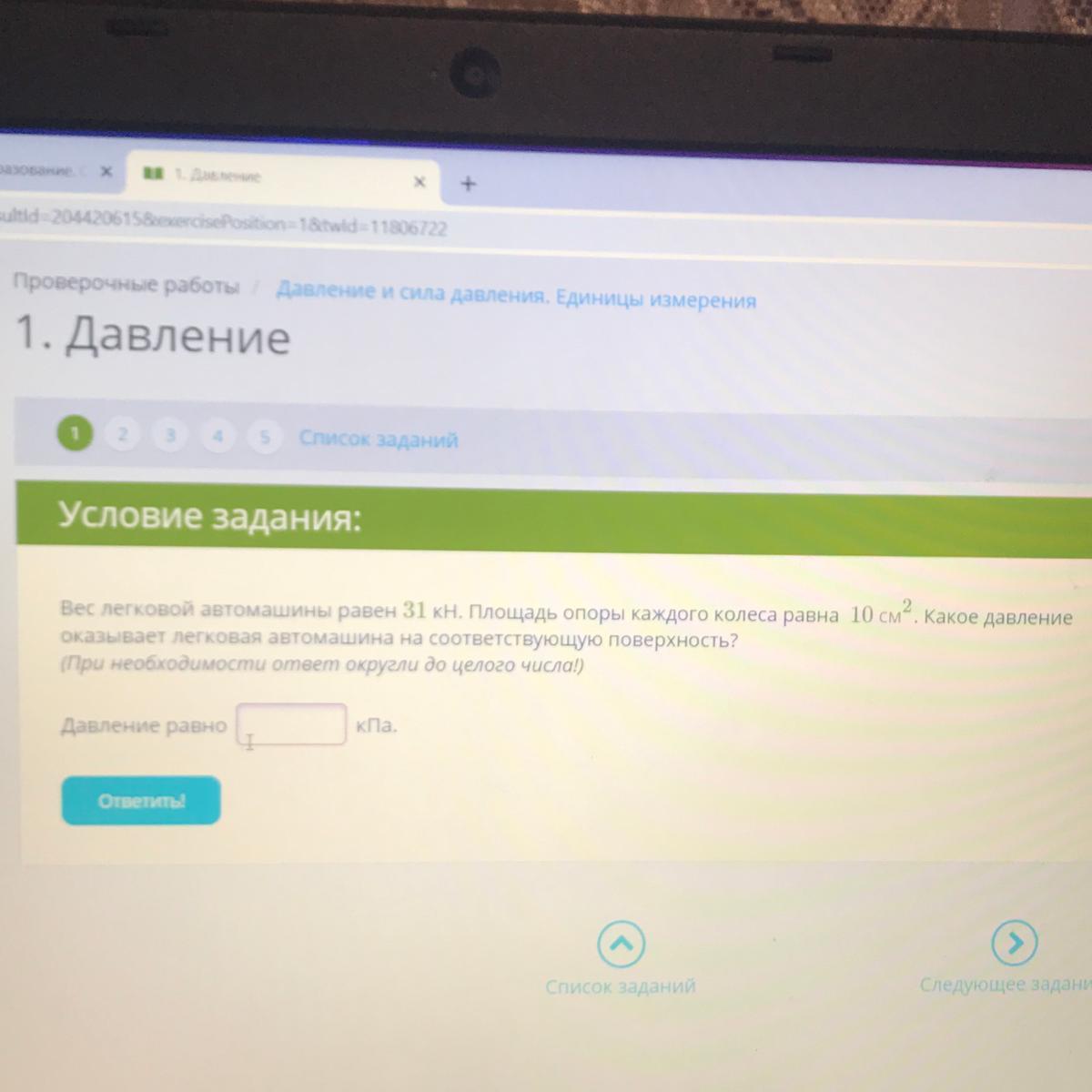 Вес легковой автомашины равен 31 кн. Площадь опоры каждого колеса равна 10 см. Какое давление