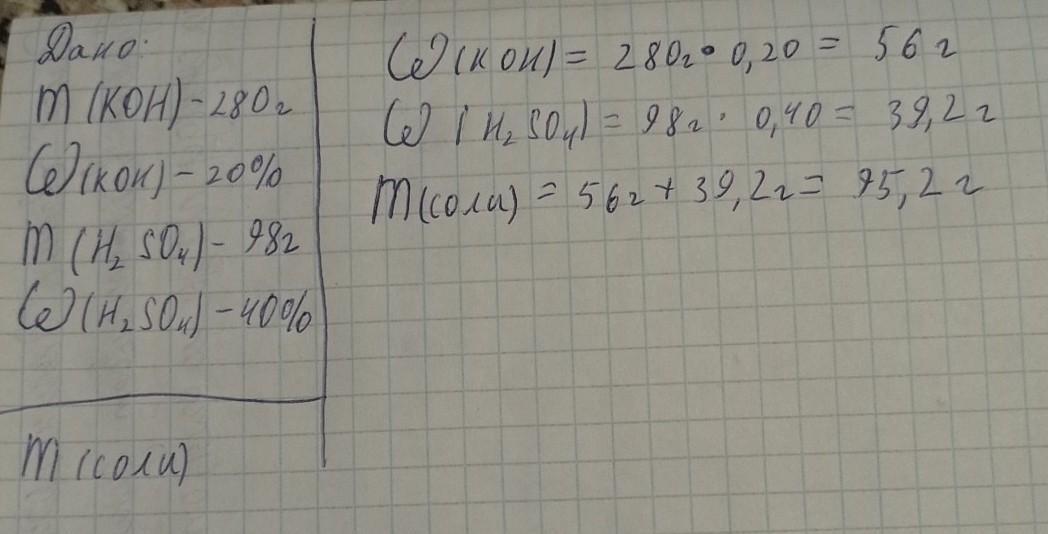 280 грам 20% розчину калій гідроксиду реагує з 98 г 40% розчину сульфатної кислоти. Яка маса солі утвориться?